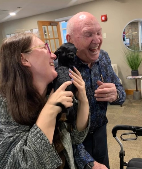 Tiffanie Beaucage, the Village's resident service manager, was holding Zeus when a resident approached, and the puppy immediately took a liking to the resident.